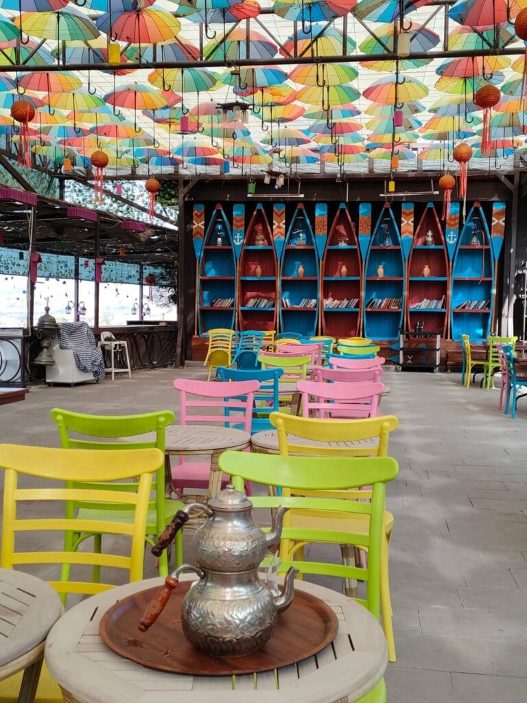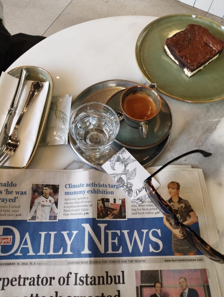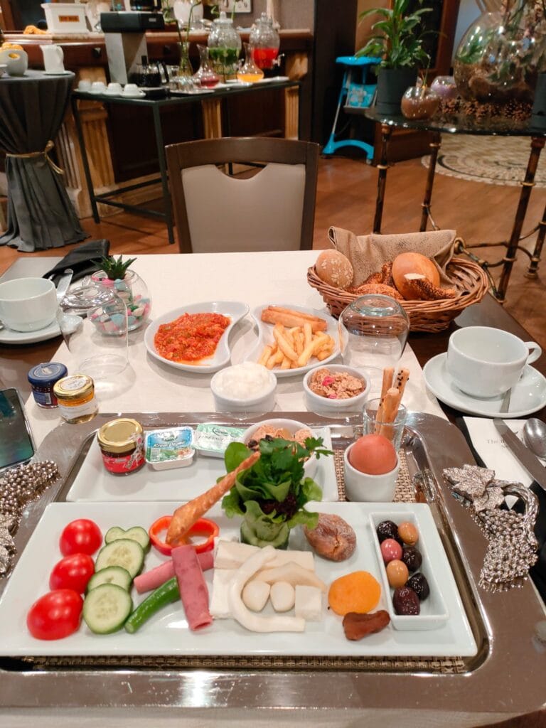 I am in the breakfast room of the Neva Palace Hotel, communicating by gesture with a kind girl who literally invades my table with a very rich tray. Symit, eggs, jams, breadsticks, fresh fruit, borek still steaming… everything is ready for me to consume the ritual of kahvalti, but at 8 a.m. I can only impress even the Turks by asking for yet another cup of coffee.