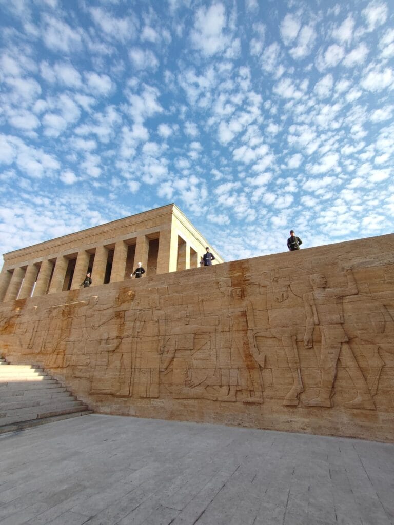 Before I take my leave, I, like all bystanders, witness the solemn ceremony. Sound silence reigns supreme, and I, as all the present Turkish citizens, lie motionless on the Anitkabir plain, chilled by the sharp wind and warmed only by a faint November light. The landscape is arid, ochre, inhospitable. Ankara resides in the heart of Anatolia, and the monolithic Anitkabir can only embody its soul. Who knows whether Ataturk would have liked it. The only note of colour is an imposing, fluttering, red Turkish flag. Its swaying movement is the only moving body, clashing with the immobility of the armed forces, which guard the leader’s burial. The Anitkabir is perhaps the metaphor of Turkey, guarding its founder, encapsulating the country’s irresistible charm: the grandeur, the reminder of the past as a guarantee of the future, magnified by the protection of the controversial, oppressive, necessary power of the armed forces. The contrast of the light spread by a Genius of history, coexisting with the darkness of uncertainty, of restlessness, of the unavoidable tension between the innumerable frictions of a land caught between East and West.