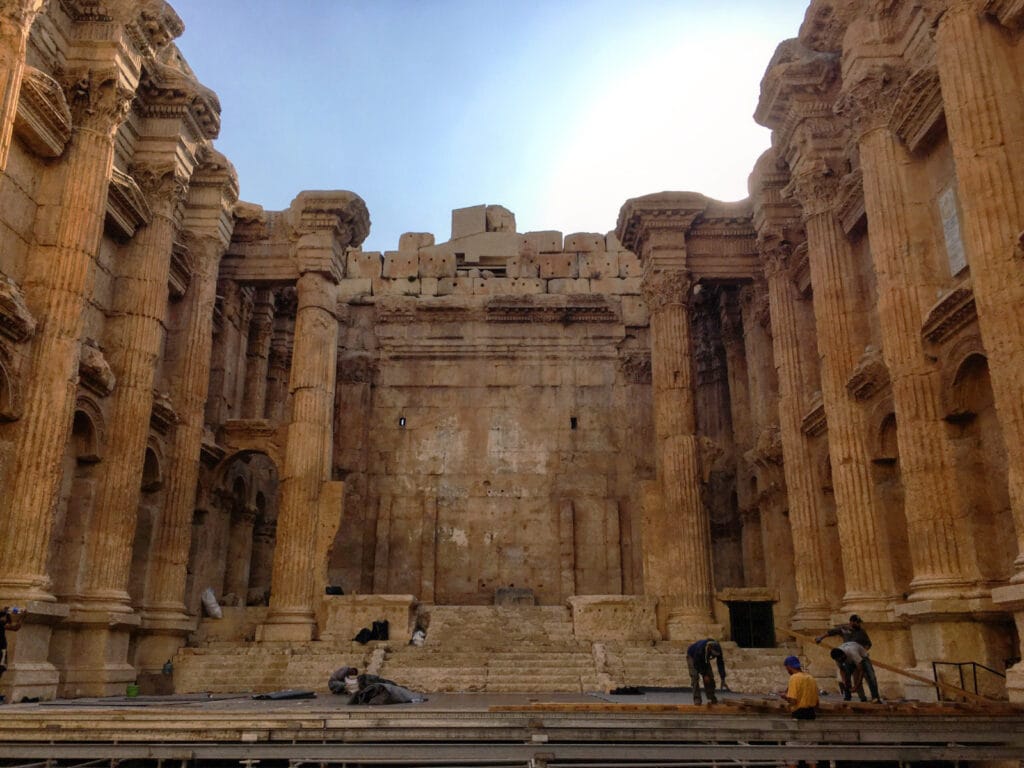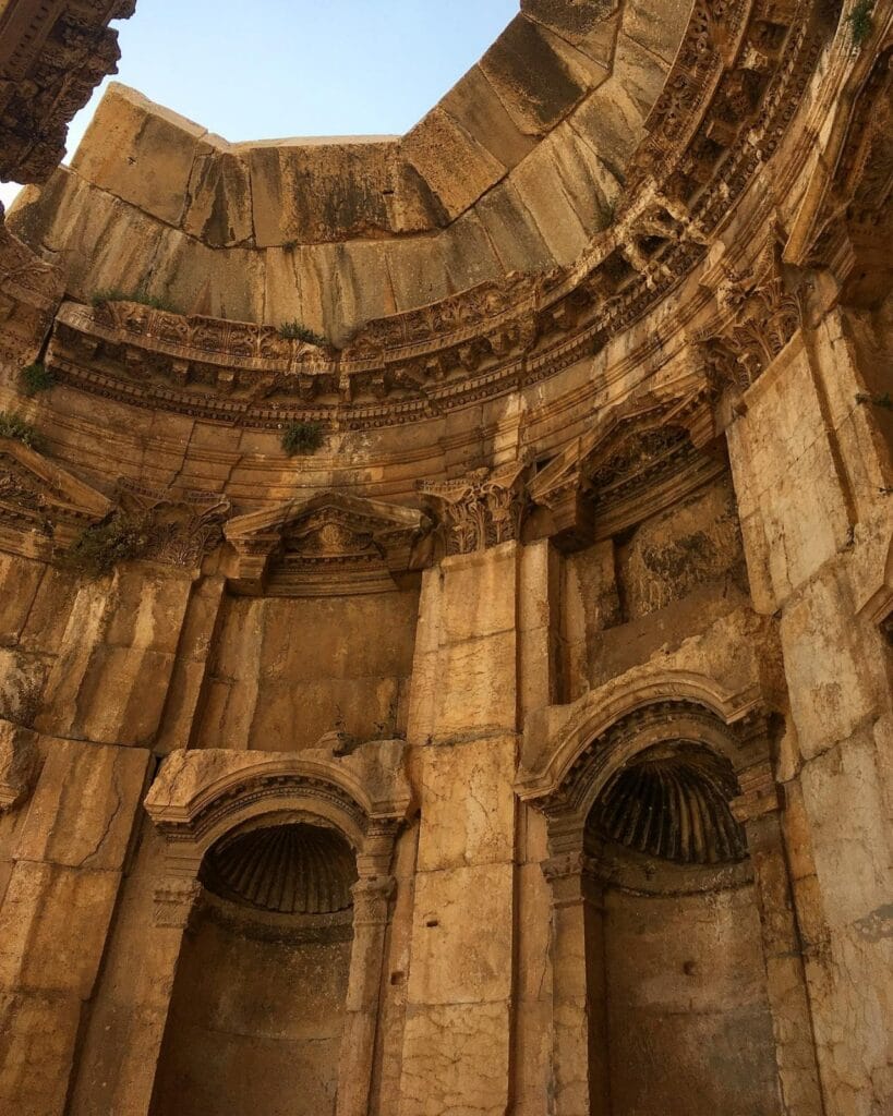 Climbing up the propylaea, more or less blinded by the sunlight, as if we were ascending the Elysian Fields, we were at the site of Heliopolis. Facing the baroque orgy of its ruins, I was overwhelmed by the grandeur. The columns, each almost two and a half metres in diameter, were the tallest in the classical world. It was a monument of great scenic impact, theatrical, overly decorative, opulent, an example of formidable Roman propaganda skills, conceived more for ostentation than religiosity. However, Heliopolis long represented a stronghold of paganism, to the point that Justinian had to order the destruction of its temples (Temple of Jupiter, Bacchus, Venus) and forcibly convert pagans to baptism, on pain of exile and confiscation of property. To ensure that the temple was not rebuilt, the Byzantine emperor ordered eight columns of the Temple of Jupiter to be transferred to Byzantium, there in the centre of the Hagia Sophia basilica. Nevertheless, at the end of the 6th century, when the Byzantine monk John Moschus visited these places, Baalbek was still the stronghold of impiety, where the pagans who had survived the numerous purges continued to persecute Christians. Not even the basilica they built at the centre of the temple of Bacchus, in a desperate attempt to suppress the militant pagans, remains of the Byzantines. It seems that French settlers deliberately removed it for pure archaeological dirigisme. Nevertheless, this site has survived it all, plundered and occupied by Umayyads, Byzantines, Ottomans, French, torn apart by interminable conflicts. Most of all, the Temple of Bacchus, built under the empire of Antoninus Pius, has survived.