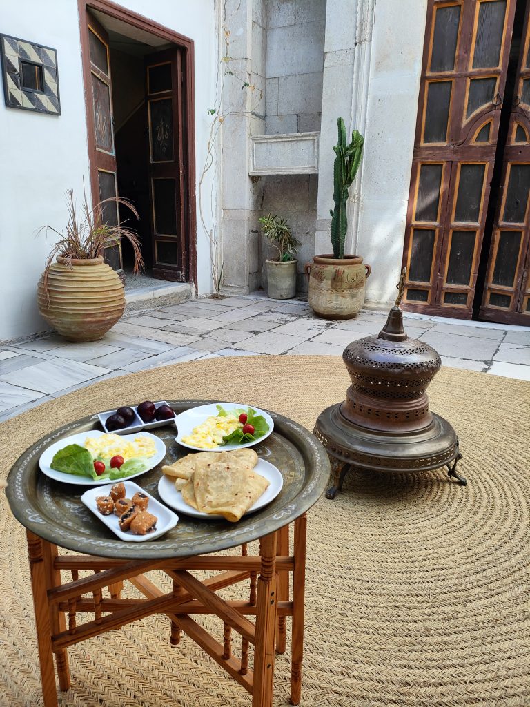 The principle of every dar, be it minute, imposing, sophisticated or meagre, is that all the bedrooms, the kitchen, the storerooms, overlook a large inner courtyard, which is the most fascinating place, the one I prefer. It is where, thanks to a large skylight, one can enjoy natural light, where one can take a nap amidst orange blossoms and placid little fountains, and where breakfast is served, always very rich: fresh figs, watermelon, melon, grapes, eggs, salad, halva, sugary juices, rivers of coffee, mint tea, and mlawi bread, a kind of very tasty crescia accompanied by very sweet jams. There we meet a girl who offers to take us to lunch, perhaps we are looking a little lost. We choose the Fondouk El Attarine, a caravanserai rehabilitated into a luxurious restaurant, craft centre, tea room. My travelling companion is assertive ‘I want to stay here, here is good for me’. At our table, kabkabou, aka the first of a long series of fish stews in tomato sauce, and fish couscous, spicy. The fish is placed, in its entirety, right on top of the well-known pile of shelled pellets. Sophisticated mise en place.