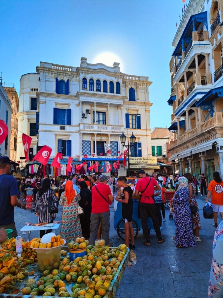 Then, hell. It didn’t look like it, crossing the motorway connecting the airport, the Bardo, and various other business districts to the city centre. There was everything I expected, palm-lined boulevards, harmless overtaking left and right, often broken-down cars, billboards advertising fast food or phantom Danone flavoured yoghurts. Suddenly we are at the Clock Tower, at the beginning of Habib Bourguiba Street, and the fury begins. It was supposed to be a long city avenue built in colonial style, with a tree-lined promenade for strolling, the Parisian-style Opera, brasseries, patisseries and cafés. But it is market day – chaos.