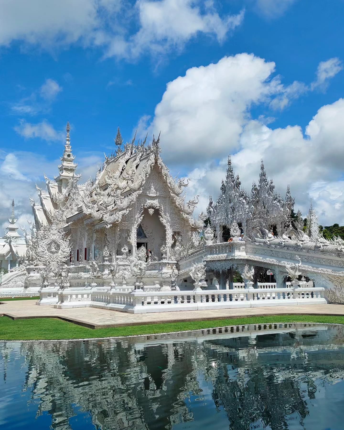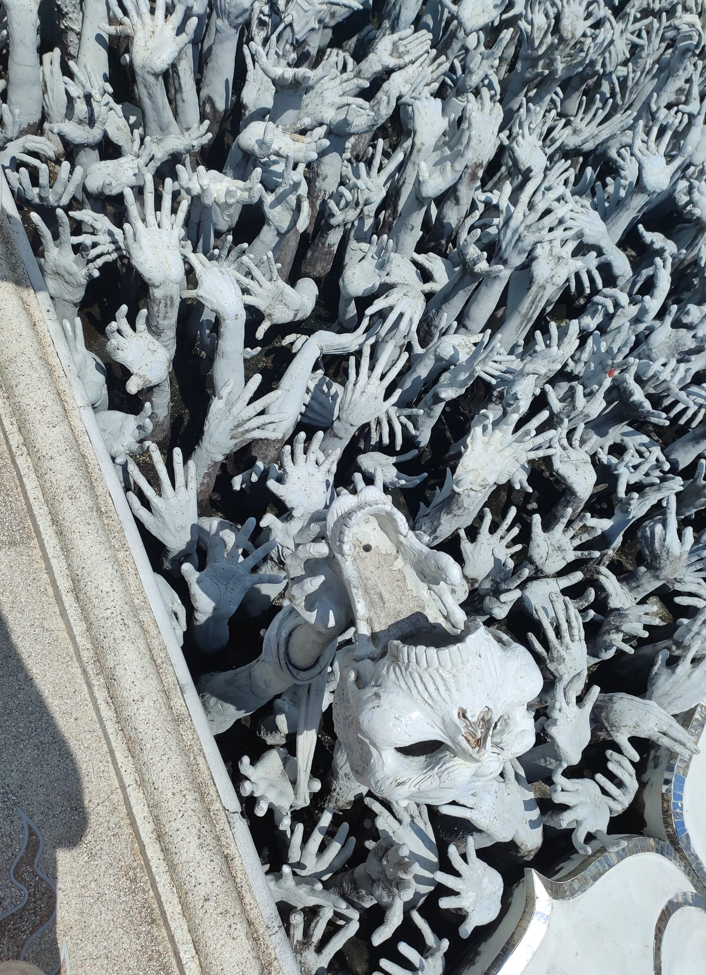 We arrive at Wat Rong Khun temple, glittering in the sun. Tui argues, ‘however extravagant, it is still a place of worship’. Thai architect Kositpipat, tiny ego, declared to the Times that this project, dated 1997, would give it immortal life and that every human being should witness his masterpiece. Called the ‘White Temple’ by us laymen, the Buddhist place of worship has an unusual colour, it seems the architect aimed to make it the ‘emblem of Buddhist enlightenment’ by setting glass mosaics that would make ‘the wisdom of the Buddha shine throughout the universe’. A loudspeaker continues to admonish us to ‘keep moving’ without forming columns, a real triumph of hieraticism. Tui is annoyed, saying that later he will take us to visit a ‘truly Buddhist’ temple where we can talk quietly about Buddha. He invites us to consider the exuberance of the temple: Hello Kitty and Spiderman are painted on the back wall, next to a depiction of the Twin Towers of New York. It was this one that caught my attention. In the Bankgok and Chang Mai temples I had witnessed the depiction of historical and religious scenes from Buddha’s life, here I came across the faces of George W. Bush and Osama Bin Laden, painted in the eyes of a demon. That is a declared extravagant fresco and, I must say, an unforgettable attempt to portray the eternal clash between good and evil.