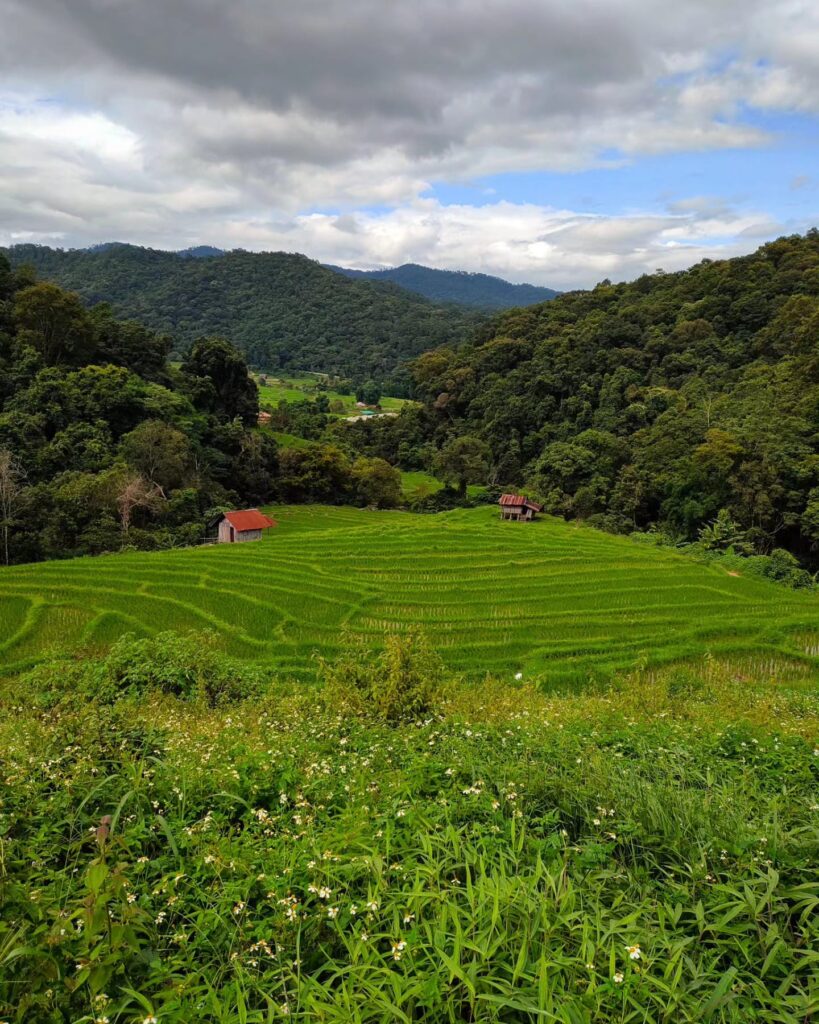 Gli occhi e le parole di Tui sono il filtro con cui vedo scorrere le verdi risaie di fronte a me, “qui vengo a passeggiare tutti i fine settimana con i miei amici di infanzia, prima che si inizi a raccogliere il riso a dicembre”. “Chissà se ora riusciremo più a farlo, visto che dalla pandemia in poi stanno iniziando a costruire strade ed infrastrutture tra Chang Mai e Chang Rai. La cosa buona è che finalmente anche noi lanna potremo facilitare la nostra vita quotidiana come a Bangkok, dove c’è lo spettacolare skytrain, la metro, i taxi..versiamo le stesse tasse! Ma non abbiamo mai avuto tutti quei servizi. Chissà che ne sarà però..del mio villaggio. Mia nonna ha paura che presto smetteremo di vedere assieme i tramonti sulla nostra valle sacra. Mi ha cresciuto così, ingozzandomi di sticky rice avvolto nei segmenti di bamboo e nelle le foglie di banani, accompagnato da ettolitri di tè. Credetemi, lo sticky rice come a Chang Rai non si mangia da nessun’altra parte, mia mamma era così contenta quando ospitai qui il mio compagno di studi in Cina, un amico di Singapore. Non riusciva a smettere di chiedere ancora altro riso! Lo mangiavamo tutti assieme a colazione, pranzo, cena. Il pad thai è un piatto per turisti, una trovata mediatica”.