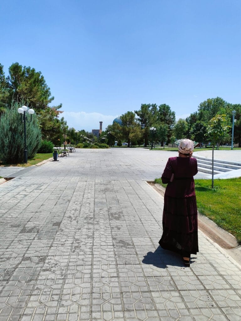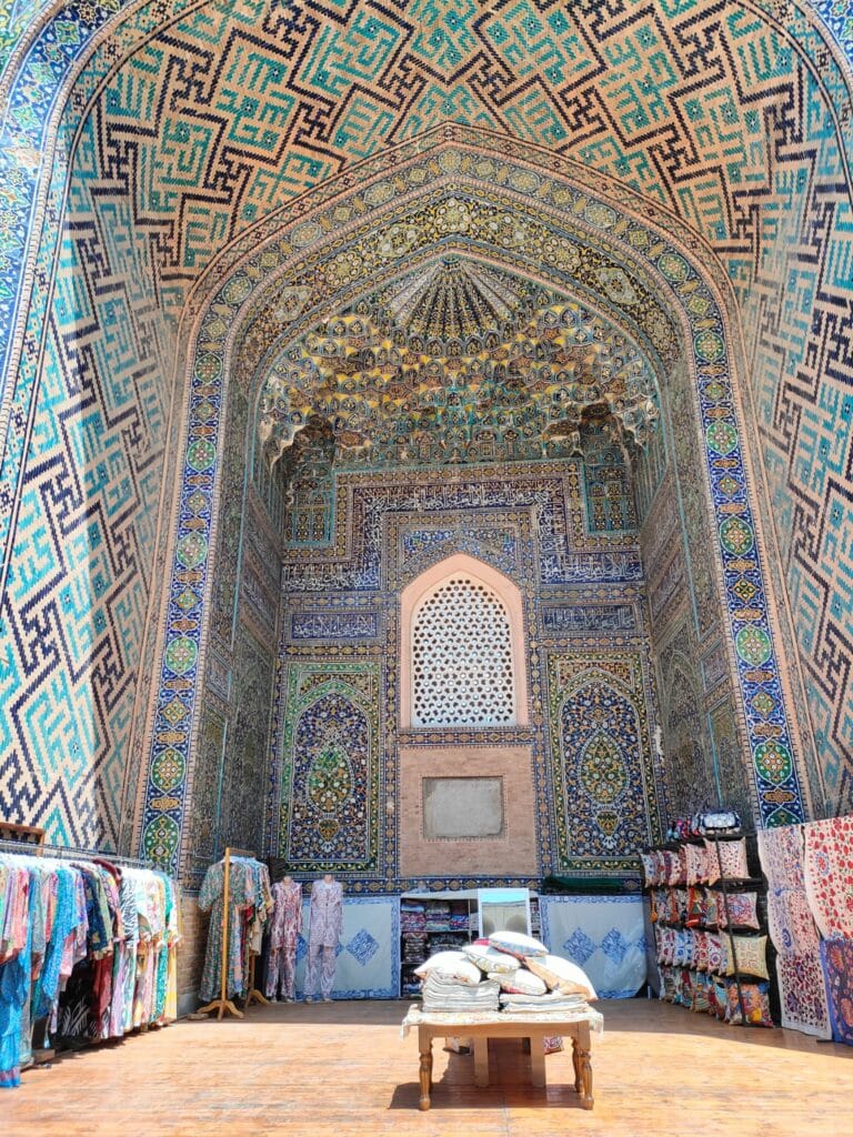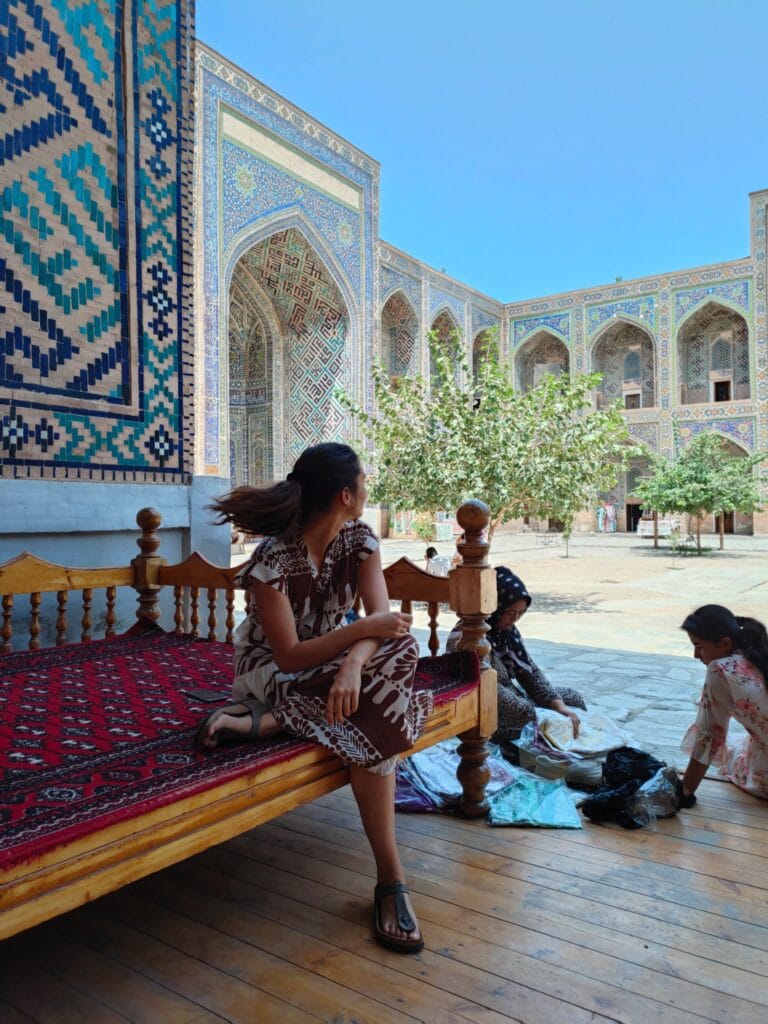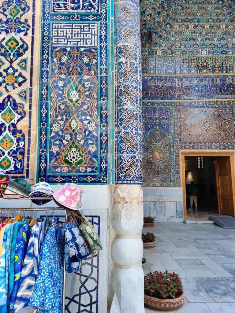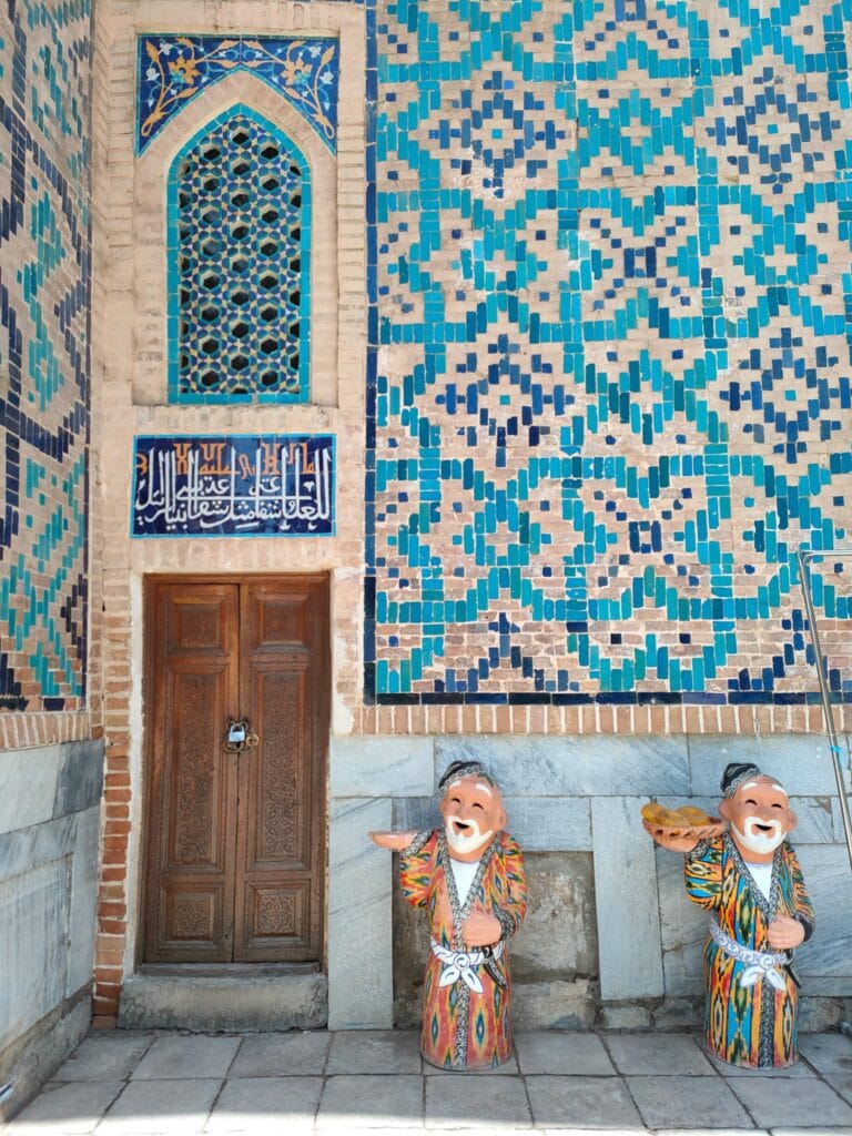 It is a complex of majestic madrasas, the Madrasa of Ulugbek (the oldest). Located on the western side of Registan, this madrasa was completed in 1420 during the reign of the eponymous ruler, a famous astronomy scholar, also known to the coeval West. The monument’s walls and portal reflect his love of astronomy through numerous inlaid stars. The other two madrasas that make up Registan are the Gold Clad Madrasa and the Lion Madrasa, the latter of which contravenes the Islamic ban on representation, as two precious golden lions stand out on the portal. The whole site is extraordinary, the polychrome, floral, dreamlike decorations, which particularly insist on the colour blue, help to exceed the expectations that my hunger for exoticism had fomented. Samarkand is real, here in front of me, and its inhabitants sit comfortably on the inner courtyard of the palace, the men wearing those colourful crocheted Uzbek hats, the women wrapping their hair in soft fabrics. Some sell carpets and cloths in the former study rooms of the madrasas, others squat barefoot on a kind of double bed to rest; some women sit on the floor with their daughters to display scarves, others drink tea on small terraces, or carve cute, distinctive gnomes out of wood. Everyone is minding their own business, placidly, when I cross their faces they look so ataraxic, at peace, they seem to be smiling, although they don’t really, it is as if there is an insurmountable barrier between me and them although it is so easy to receive their serenity.