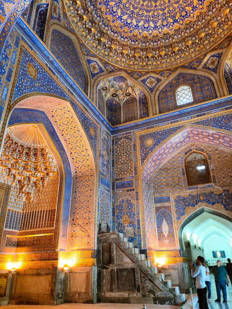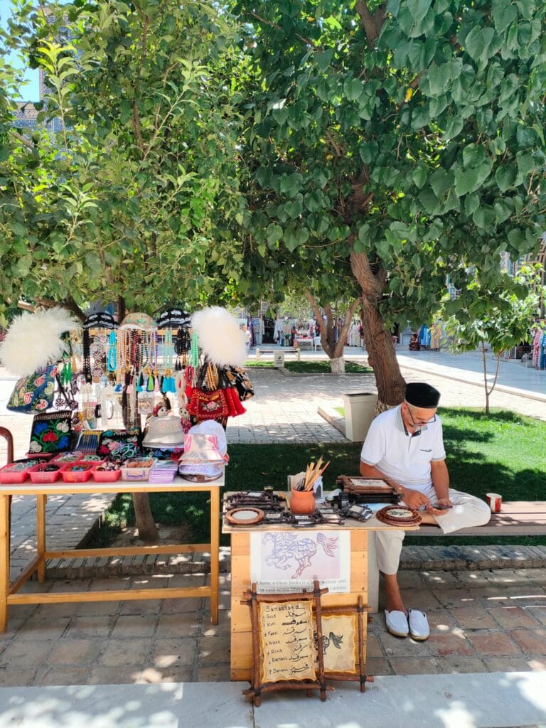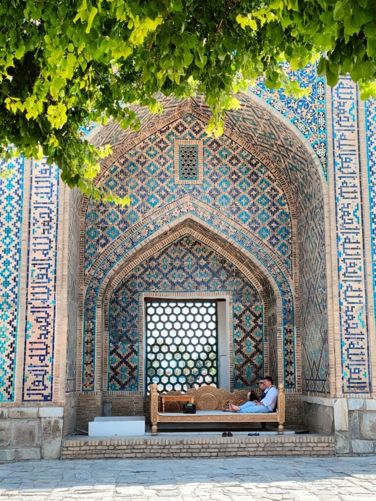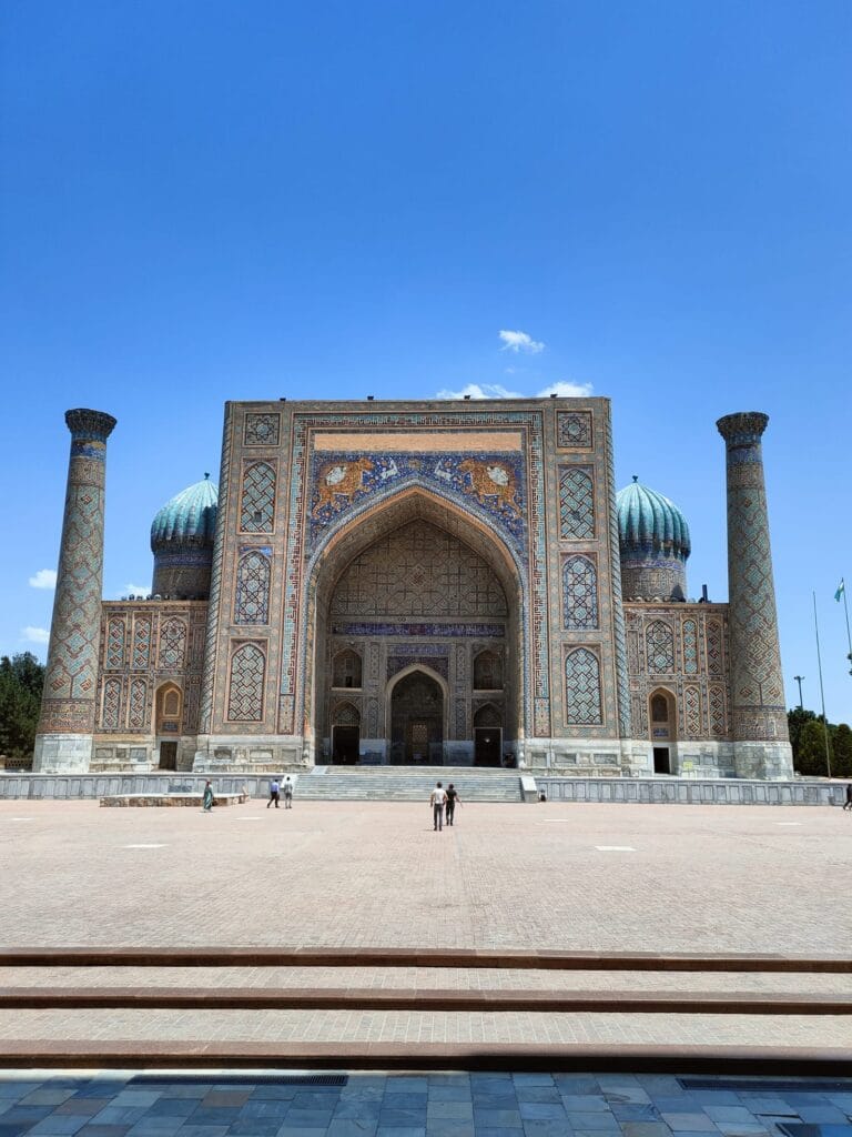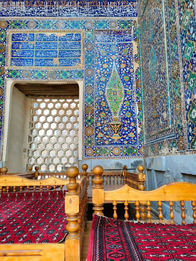 It is a complex of majestic madrasas, the Madrasa of Ulugbek (the oldest). Located on the western side of Registan, this madrasa was completed in 1420 during the reign of the eponymous ruler, a famous astronomy scholar, also known to the coeval West. The monument’s walls and portal reflect his love of astronomy through numerous inlaid stars. The other two madrasas that make up Registan are the Gold Clad Madrasa and the Lion Madrasa, the latter of which contravenes the Islamic ban on representation, as two precious golden lions stand out on the portal. The whole site is extraordinary, the polychrome, floral, dreamlike decorations, which particularly insist on the colour blue, help to exceed the expectations that my hunger for exoticism had fomented. Samarkand is real, here in front of me, and its inhabitants sit comfortably on the inner courtyard of the palace, the men wearing those colourful crocheted Uzbek hats, the women wrapping their hair in soft fabrics. Some sell carpets and cloths in the former study rooms of the madrasas, others squat barefoot on a kind of double bed to rest; some women sit on the floor with their daughters to display scarves, others drink tea on small terraces, or carve cute, distinctive gnomes out of wood. Everyone is minding their own business, placidly, when I cross their faces they look so ataraxic, at peace, they seem to be smiling, although they don’t really, it is as if there is an insurmountable barrier between me and them although it is so easy to receive their serenity.