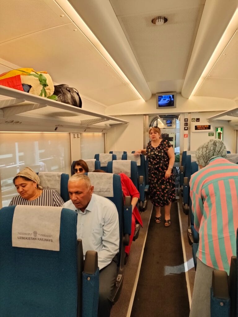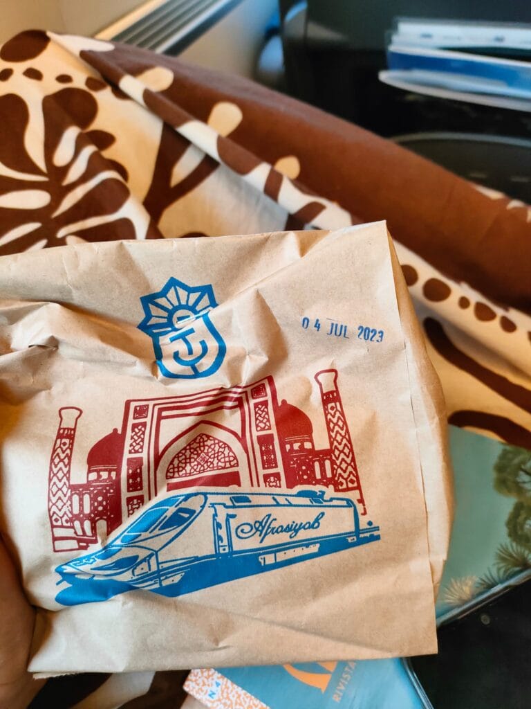 I arrive at the station in a daze, the dry July heat of the steppe overcomes the massive doses of caffeine ingested at breakfast, I thought they were enough along with my usual energetic kasha, combined with a long, billowing dress to cope with a hot day of travel. Summer hypotension boggles my mind at the thought of the Samarkand of myth; who knows, if I will find the languid, colourful, perfumed atmospheres imagined in Orientalist autosuggestions. Well, the passengers circulating the lobby seem to have their feet more anchored to the ground than me. Some are munching, as is usual in these parts, on sunflower seeds, others take their seats piling up luggage, saddlebags, provisions of all sorts. Although it feels like we are inside a large shopping mall, fast food outlets do not exist. Rather, there are sort of little stations, market stalls, where multiple stuffs are sold: baskets of Uzbek bread with an exaggerated diameter, cigarettes, pomegranate juices, toys, handkerchiefs, the iconic milk chocolate bars with Alenka’s famous little face, straight from Moscow. Then I see a two-metre tall giant standing out, he will take my own Afrosiyob train (the ancient name for Samarkand), the one which will carry us to our destination in two hours of high speed. The train is comfortable, so comfortable that instead of immersing myself in the uniform landscape of the steppe I am sucked into the funnel of sleep, only the tea lady wakes me up to water me and hand me a packed snack offered by the railway company. After all, we are on the Silk Road, tea is ritual, rhythm, contemplation.