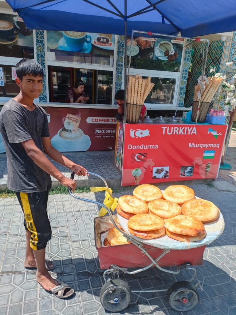 In Samarkand, I am met by a driver with an unpronounceable name, nice elongated eyes, the usual raven fringes that are fashionable in these parts, he speaks good English, he worked in the UK for years in a pub. The station tries to resemble the Registan Palace in tone, or at least the Soviets tried to. I see the tall man again, who smiles at me, and then I change street, I don’t plan to spend time making new acquaintances today. Soon after I am at the Cafeteria Chocolat for my appointment, where a bizarre Sachertorte (without any chocolate shadow) stands out, who knows, maybe it is the Uzbek recipe. Lunching on rice pilaf, I set off again, heading for the Registan palace. The streets of Samarkand are a dejavu, they remind me of the neighbourhood where I lived in Baku. Orthogonal street plan, potholes here and there where I could easily amputate a leg, kitty cats everywhere. Cemented parks, alas, caykhane here and there, hawkers selling bread, stocking it and dragging it in wheelbarrows. Smouldering samovars sit next to doners, with that inviting aroma that makes you want to bite into them under Coca Cola umbrellas. And here, in a corner of the city, are the souls of the country: Caravanese, post-Russian, Turanian, Arab, shyly winking at the West. Just like the characters that appear here and there, Cyrillic, Latin, Arabic. The language is another sign of this mixture: the majority language, Tajik (a dialect of Farsi), sits alongside the Turkic Uzbek spoken in the rest of the country, Russian, the lingua franca of intergenerational and international communication, and English. After all, we are in the largest land trade junction between China and Europe, a carrefour par excellence; it is no coincidence that Alexander the Great conquered the city just a few centuries ago, and was enchanted by it, it became the ‘third Alexandria’.
