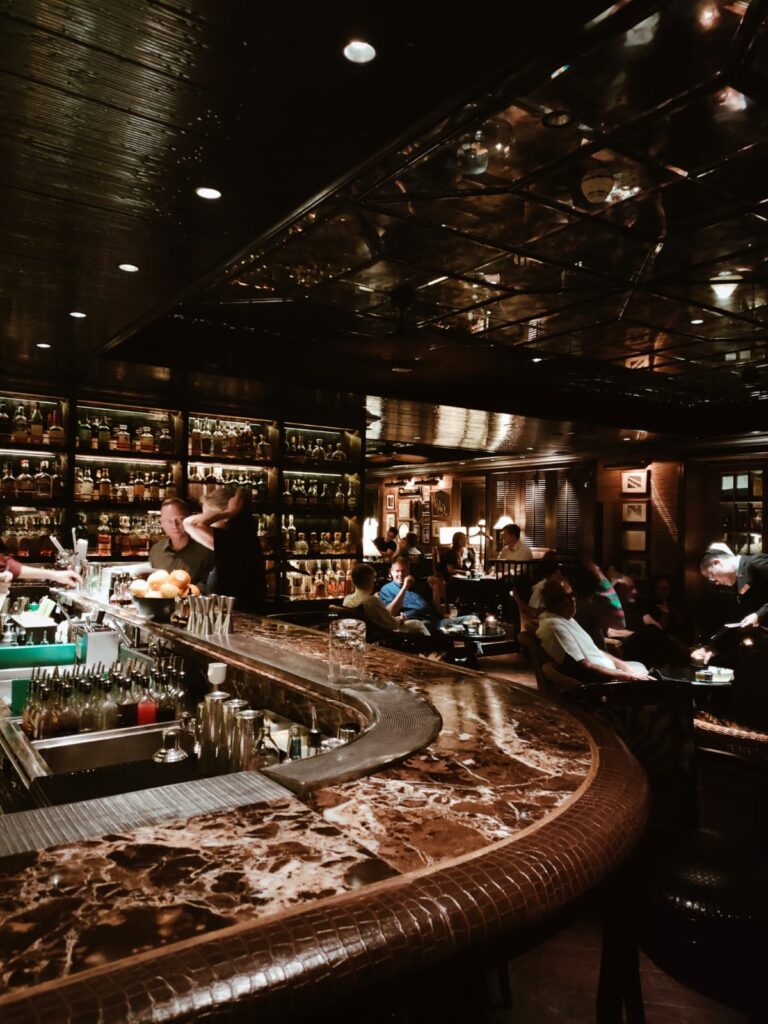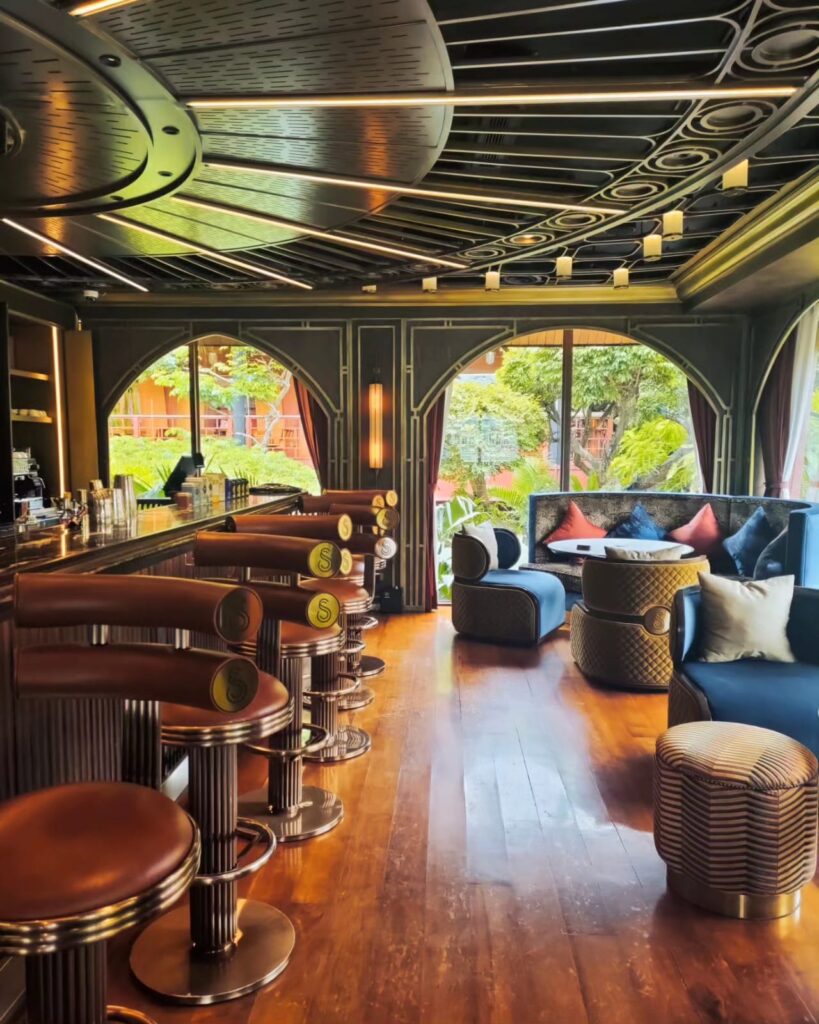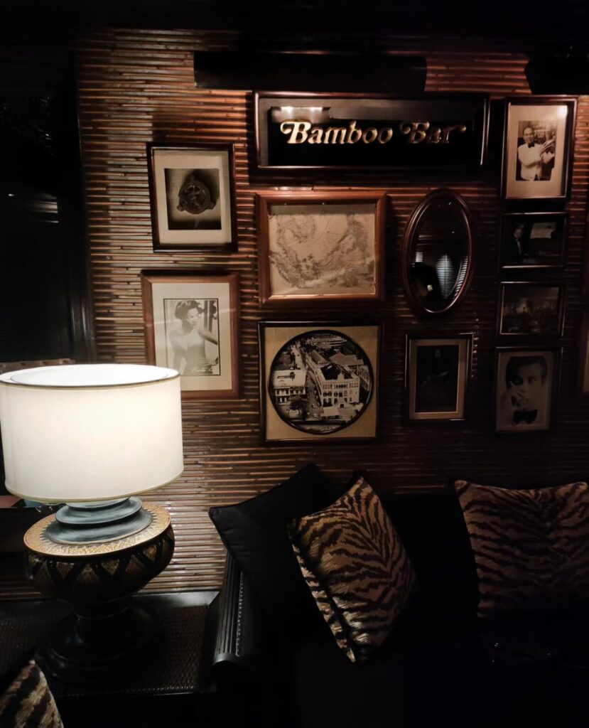 La fama senza tempo di questo bar deriva appunto dall’appartenenza a uno degli hotel più antichi dell’Asia, affacciato sul Chao Praya. C’è la cultura del lusso e il lusso della cultura. Il Mandarin Oriental è un luogo che mette in condizione di apprezzare il tempo che scorre, lo spazio culturale in cui il viaggiatore sofisticato può caricarsi di quello spirito asiatico che sta ridefinendo l’Oriente diffondendosi al contempo in Occidente. Un tempo era posseduto da Louis Thomas Leonowens, figlio della famosa Anna Leonowens, istitutrice del modernizzatore Re Mongkut negli anni del Trattato commerciale di Bowring (1855) tra Regno del Siam, Gran Bretagna e Irlanda. Il famigerato Bamboo bar è tuttora un’icona di Bangkok, dove i viaggiatori old money e gli esponenti dello star system si recano per osservare o essere notati. E’un luogo intensamente estetico, dove mi reco per immergermi in un’atmosfera da proibizionismo in allure orientale rivestita di legno scuro, sedie di rattan, tavoli in marmo e caratteristici ventilatori che sfumano gli effluvi dei sigari degli oziosi altolocati. Un luogo perfetto per Jim Thompson, per i farang, (per me?), per gli stranieri viziati e viziosi da sempre sottoposti all’impietosa indagine radiologica dei locals.