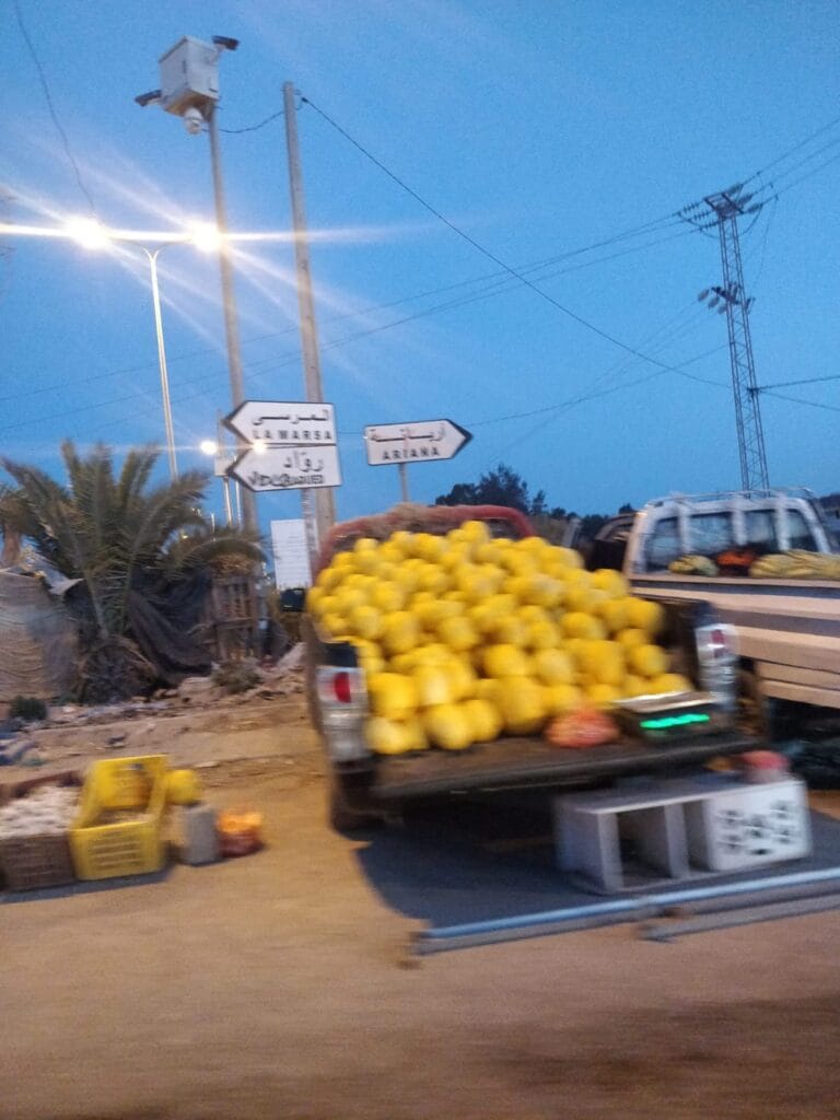 E’ gia ora di lasciare il Cheeky, quasi siamo entrati in famiglia, più che altro ci sembra di lasciare una comune. Il cane, la figlia della proprietaria dai riccioli d’oro, piccolina di cinque anni, già si è affezionata a noi e ci chiede “pour quoi allez a Tunis?”. A momenti nessuno si ricorda di farci saldare il soggiorno. Il timore è che questo eden tra mare e laguna sia stato l’ultimo agio prima del viaggio verso le Colonne d’Ercole. Ci rimettiamo in viaggio. Dobbiamo riscendere verso Tunisi, costeggiando il Mediterraneo, e arrivare per cena al vecchio porto, la Golette appunto. Dopo un po’ di esitazione scegliamo di fare la strada normale, per vedere l’entroterra. Dopo un’ora di colonna finalmente imbocchiamo la nostra deviazione. E’già sera, ci inoltriamo nella simil strada provinciale che congiunge i due maggiori centri abitati di Kelat el Andaluus e Raoued. In mezzo, quasi il nulla, una distesa brulla e uniforme, i lampioni stradali spenti, poi una rotonda, un fuori strada fermato da controlli di ruotine della polizia militare, che ogni tanto ispeziona a random qualcuno in entrata e uscita dai nuclei abitati. Niente di minaccioso. Abbasso il finestrino per poggiare fuori il braccio, mi piace scavare nel vento estivo per sentirne il profumo, il velluto, ma i cumuli di immondizie annullano quello che mi aspetto di reincontrare, l’amato aroma della macchia mediterranea. La spazzatura è ovunque, indisturbata, dentro e vicino al mare, accanto o sulle coltivazioni, avvelena la magia della splendida natura tunisina. Come degli intrusi, capitiamo in villaggi, o meglio, in inurbamenti costruiti ai lati delle strade o attorno a delle rotonde, notando case iniziate e mai finite, donne completamente coperte con in braccio e a seguito bambini, bar per soli uomini, macellerie con teste di montoni sgozzate e appese, pare sia indicativo della freschezza della carne del giorno. Nelle circonvallazioni, pick-up, camion, e sedicenti mercati all’aperto 24/7 vendono enormi cocomeri, meloni gialli, fichi d’india, uva, si mercanteggia anche la notte. A un certo punto sfrecciamo vicino a una moschea, c’è una gran folla, “andiamocene” penso tra me e me. Il mio copilota chiede di rallentare, è in atto qualcosa di molto strano. Al centro di un grande semicerchio due cavalli al trotto stanno trasportando due bambini, una dai lunghi capelli neri, gli astanti applaudono attorno, sarà una festa di paese, un rito di passaggio? “Andiamocene”, dico.